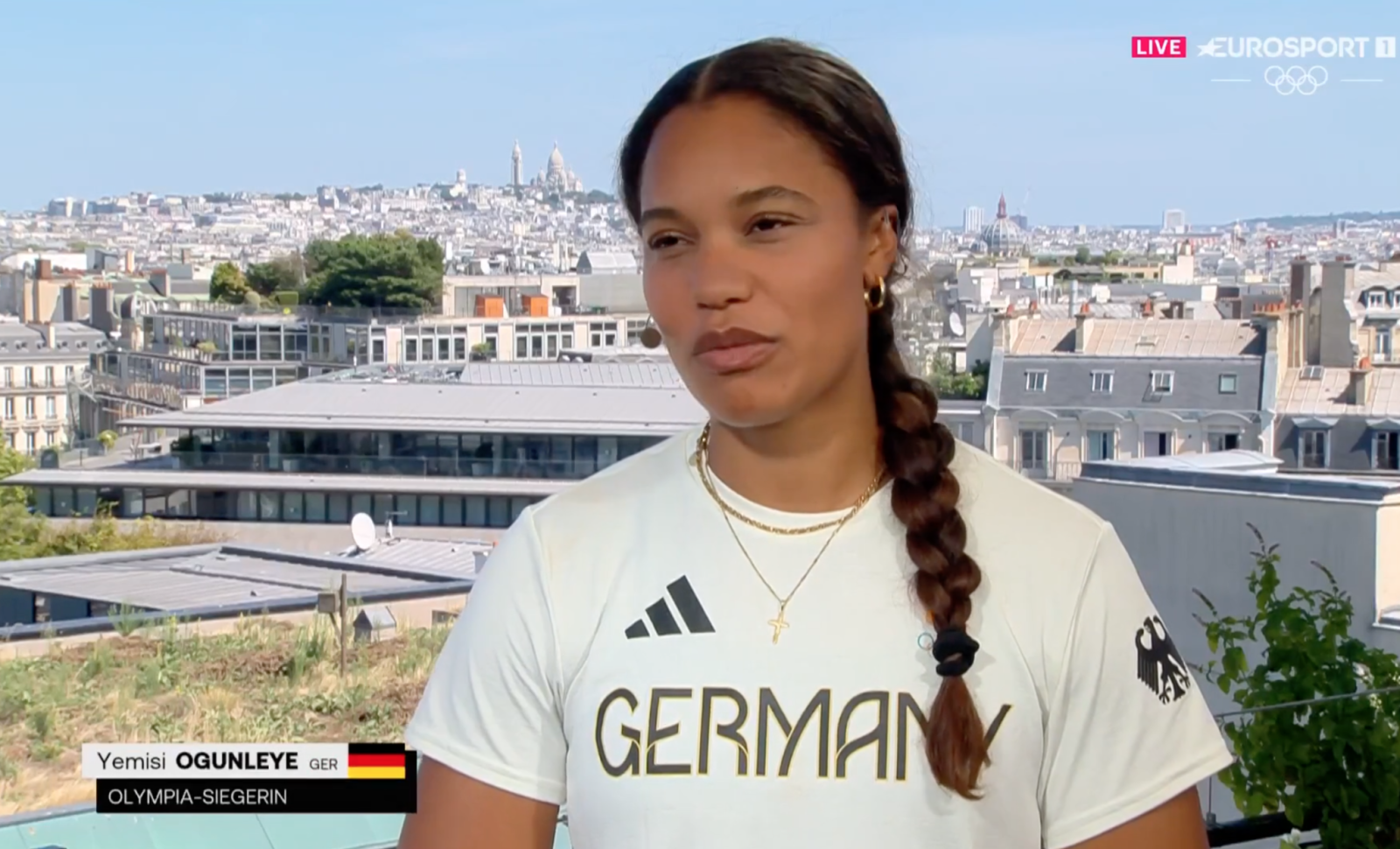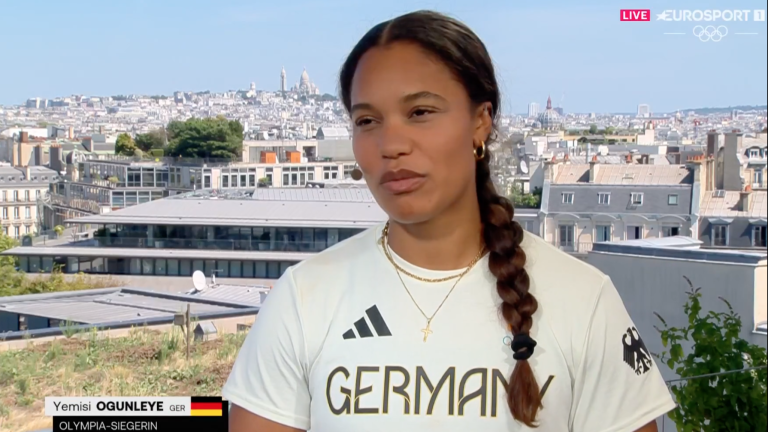 Olympia 2024: Shot putter Yemisi Ogunleye sings a gospel song after her gold interview in the Eurosport studio